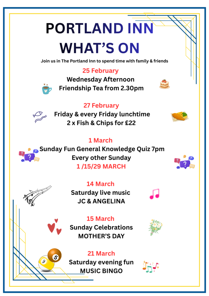 “Let’s have a pub lunch “ ……choose The Portland for a great meal out. Lots of delicious choice on the menu from lite bites, homemade soups, all the pub classics including steak & ale pie and Chefs Specials